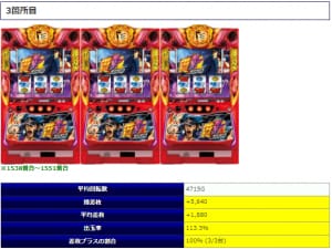 最終的な結果としては平均差枚+1,523枚、平均出率110.7%、勝率86%と高水準な結果となりました。①~②箇所目で対象となった「チバリヨ」は『4台並び』のサプライズな仕掛けとなったようですね。①箇所目に関しては平均3,862回転で平均差枚+1,020枚と安定感のある結果に。そして②箇所目では4,732回転とそこそこの打ち込み量となっており、平均差枚+2,388枚で全台差枚プラスと説得力の高い内容となりました。