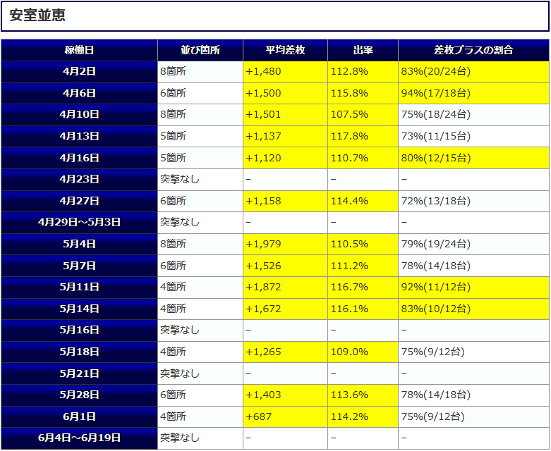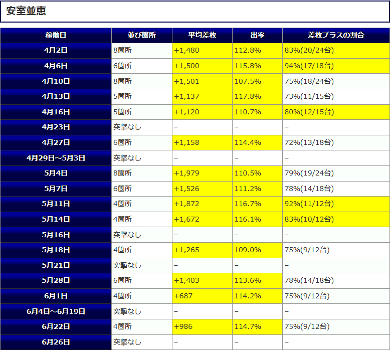 最終的な結果は平均差枚+986枚、平均出率114.7%、差枚プラスの割合75%(9/12台)といった結果となりました。今回も定番の「沖スロ」での仕掛けとなりました。