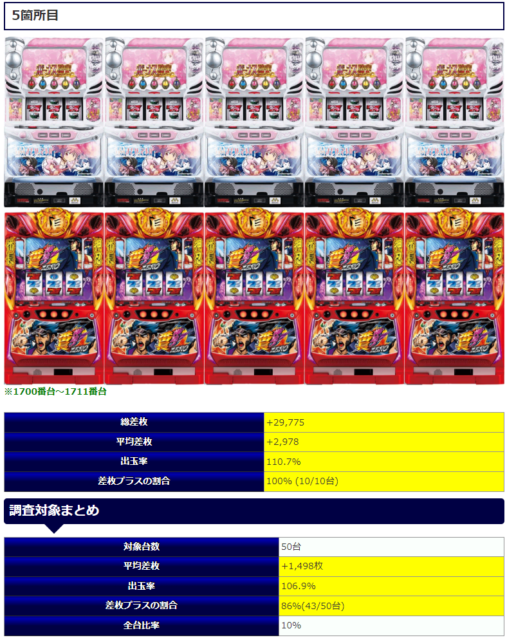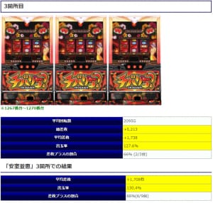 ②箇所目の「チバリヨ」では平均回転数1,928回転と控えめな打ち込みとはなりましたが、平均差枚+1,843枚を記録、③箇所目も同様で平均2,095回転に対し平均差枚+1,738枚と両箇所で好調な結果となりました。