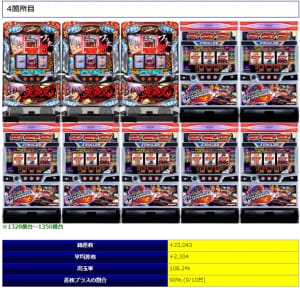 ①箇所目の「ホウオウ天翔」では平均4,151回転の打ち込みがあり平均差枚+527枚で勝率66%で1台のみマイナス差枚となってしまったようですね。②箇所目の「沖ドキDUO」では平均回転数998回転と控えめながらも平均差枚+1,242枚、全台差枚プラスの好結果となりました。本機の一撃性を上手く活用できた結果となっていますね。