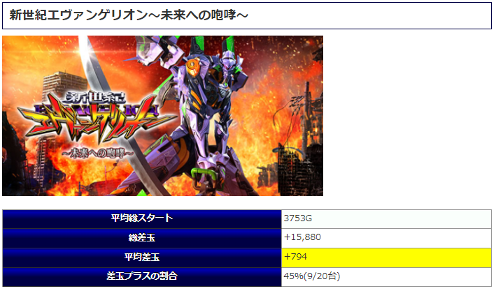 事前ピックアップ5機種より「エヴァ未来」が選ばれたようです。さすがの人気機種といった感じで平均約4,000回転の終日の粘り込みを披露するも、惜しくもマイナス差玉となってしまったようです。
