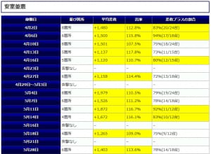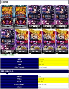 ①~④箇所目の「沖ドキDUO」「チバリヨ」に関しては機種の特性上か平均回転数が2,000~3,000回転前後の打ち込みとなっており、平均差枚も1,000枚前後、機械割110%を超える数値を各箇所で確認でき、ポテンシャルを上手く発揮できた結果となりました。