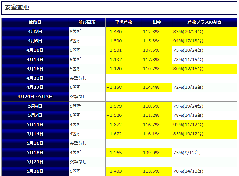 最終的な結果は平均差枚+1,403枚、平均出率113.6%、差枚プラスの割合78%(14/18台)と高水準な結果となりました。