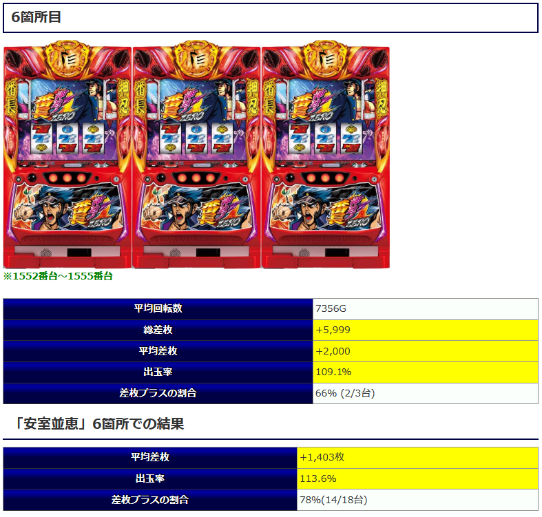 一方⑥箇所目の「番長ZERO」では平均回転数7,356回転と終日の粘り込みが確認でき、平均差枚+2,000枚、平均出率109.1%と1台のみマイナス差枚となってしまいましたが納得のできる数値となったのではないでしょうか。