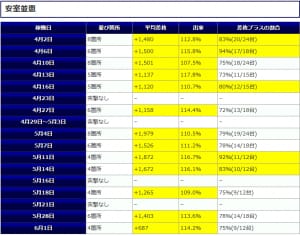 最終的な結果は平均差枚+687枚、平均出率114.2%、差枚プラスの割合75%(9/12台)といった結果となりました。
