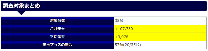 平均差玉+3,078発、合計差玉+107,730発、勝率57%(20/35台)と中々に高水準な結果を記録しており、対象機種を見てみても人気のある機種での仕掛けとなっていますね。