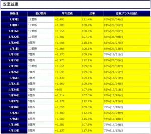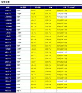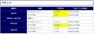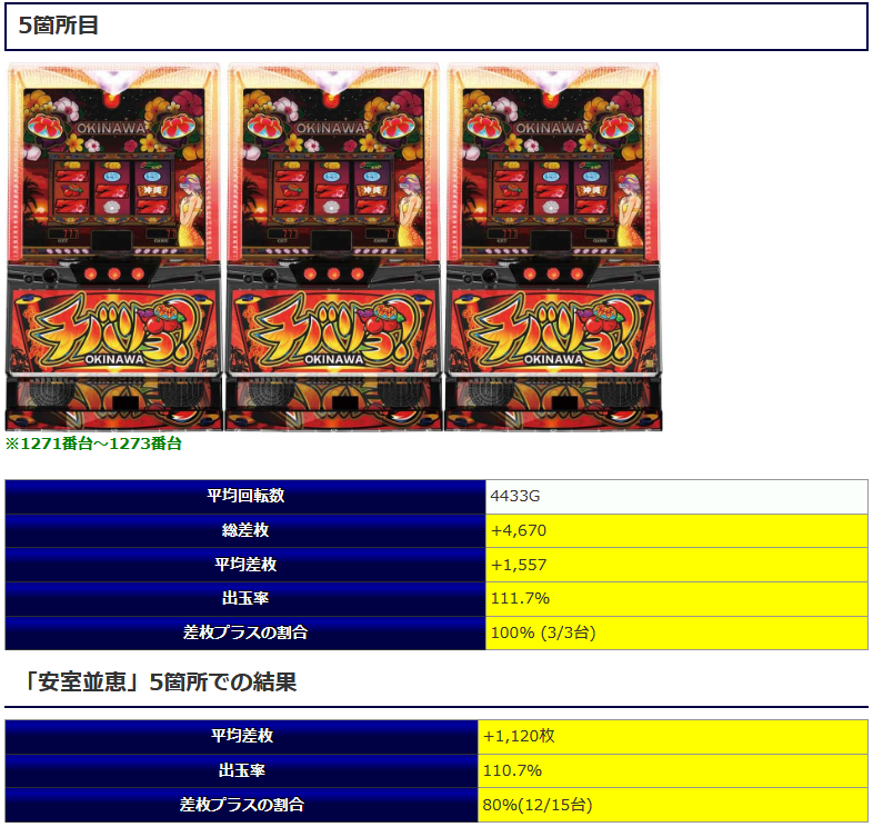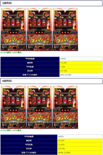 ③箇所目の「チバリヨ」に関しては差枚プラスの割合50%(5/10台でプラス)という結果でしたが平均差枚+3,721枚とプラス5台が大きな差枚を作る結果となっていますね。