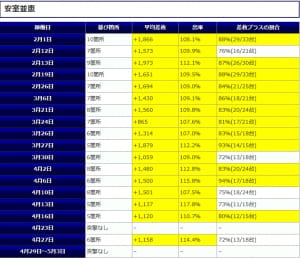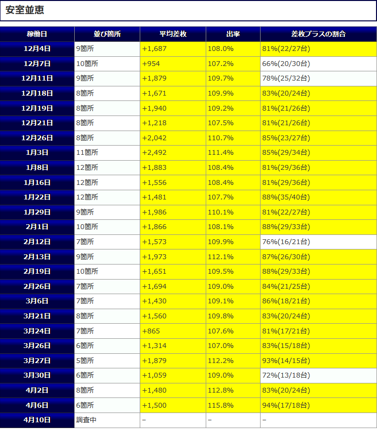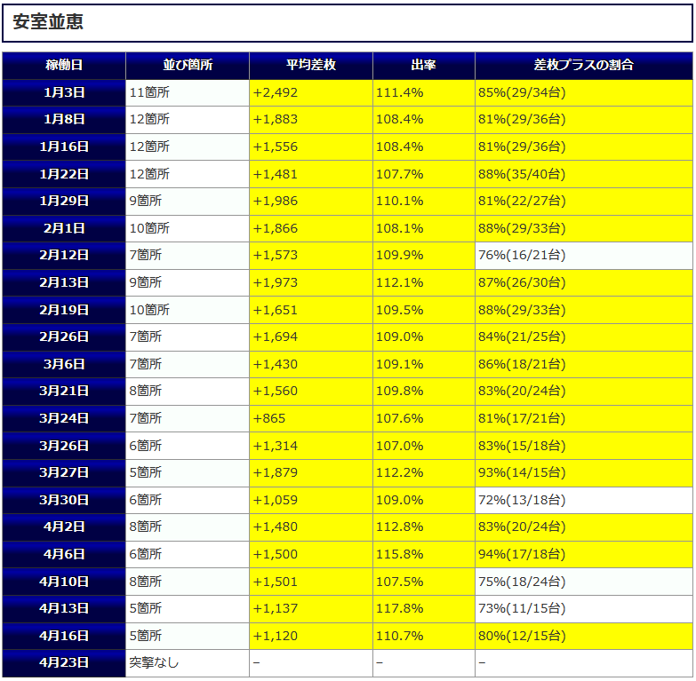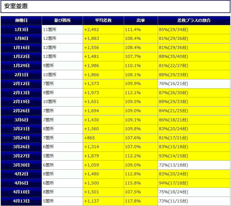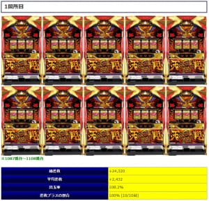 最終的な結果は平均差枚+1,137枚、平均出率117.8%、差枚プラスの割合73%(11/15台)と高水準な結果となりました。