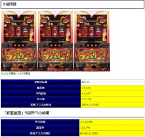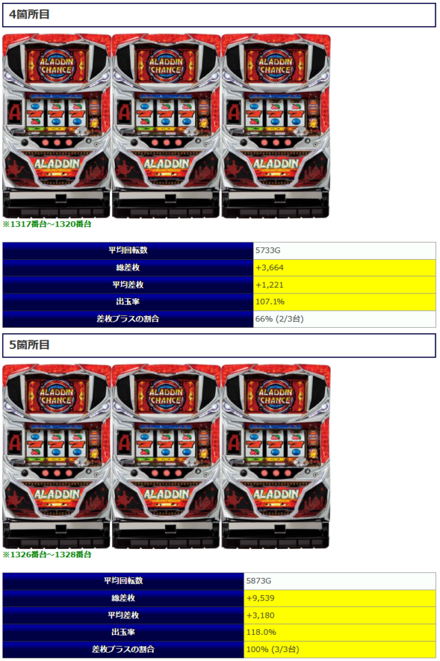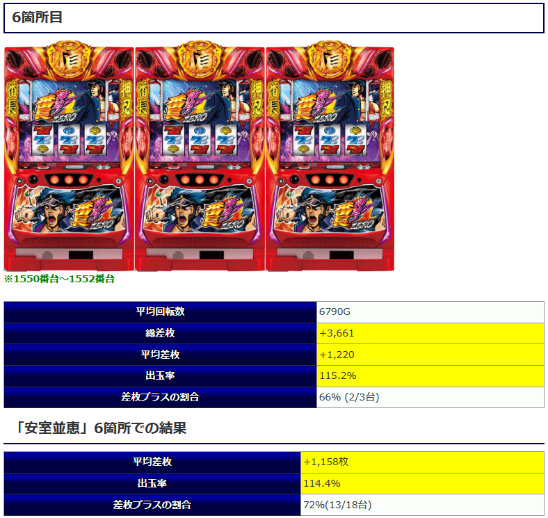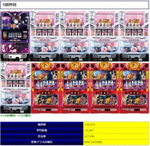⑤箇所目は人気シリーズでの構成となりました。総差枚+20,671枚と①箇所目に次いで好調な結果となりました。人気シリーズだけに期待したユーザーも多かったでしょうから、当日対象箇所に座れたユーザーは楽しい1日を過ごせたに違いありませんね。