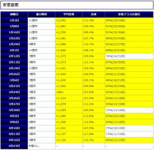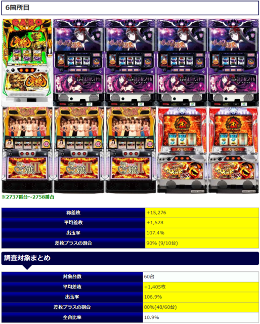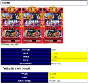 ⑥箇所目も差枚プラスの割合90%と好調な記録を残し、平均差枚+1,528枚と安定した結果となりましたね。