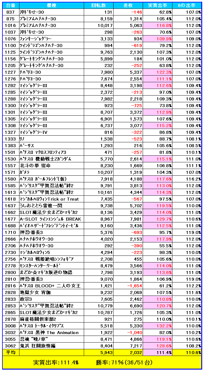 番長3から+5,000枚クラス、+4,000枚クラスのやらかしもあった事が出率を引き上げた要因ですが、ある意味同店では毎回この程度の出率は叩き出していますので、中身はしっかり、ただ攻め切られないケースが多い事が見て取れますね。