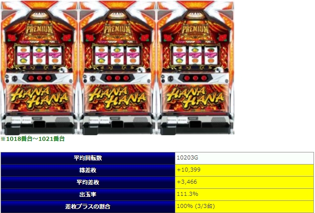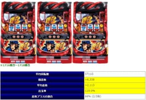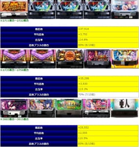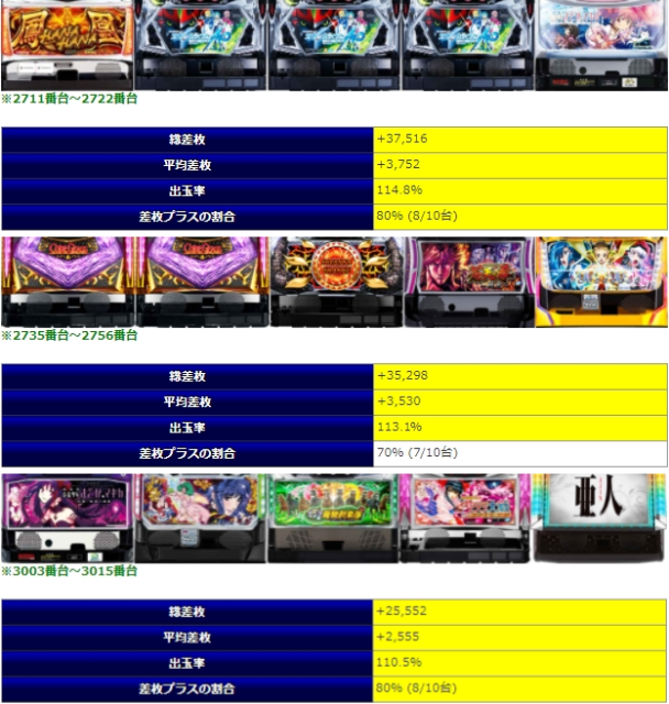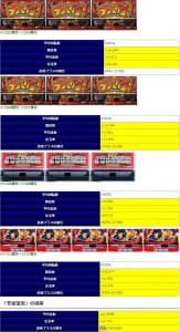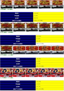8箇所用意された「並び」全体で平均差枚+3,159枚、出率114.7%、勝率92%と全体の回転数でも26台の平均で7000G前後と、これは圧倒的な好結果。