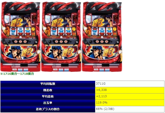 6号機から「政宗3」で+7,332枚、「まどマギ前後編」で+5,517枚、「バジ絆2」で+4,838~+5,771枚と3台出揃い、、5号機と遜色無い強い結果が多く出現し、5号機からも勿論「番長3」から+8,853枚、「まどマギ2」から+7,039枚と存在感を示す台が現れている。