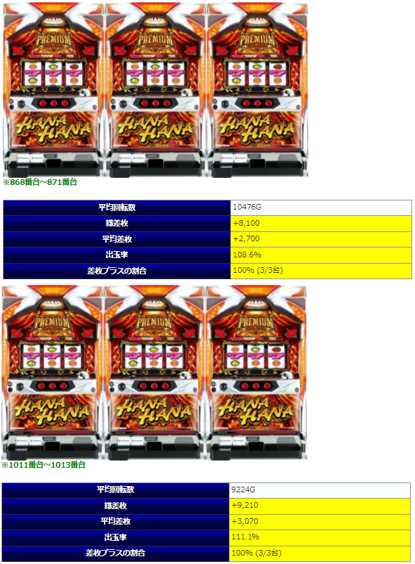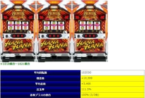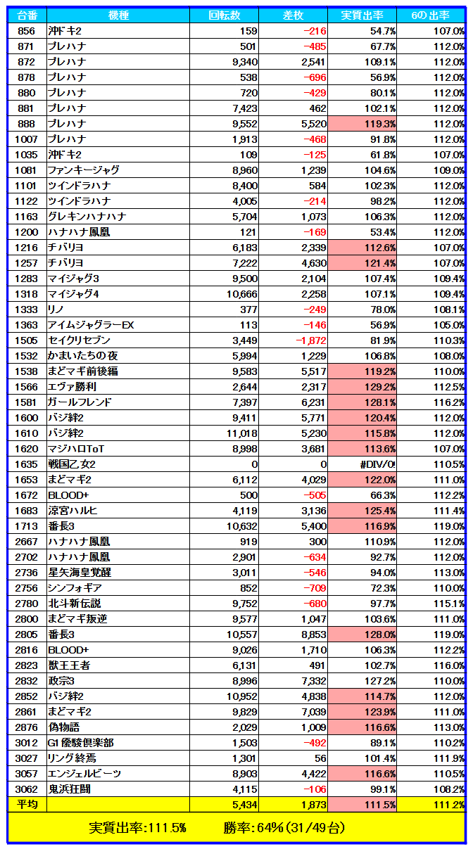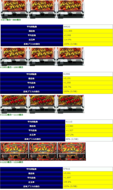 「プレハナ」での3台並びで1箇所のみ出率105.7%と不発感が漂っていますが、それでも勝率は100%であり、安定し辛い「チバリヨ」も含めてその他全ての箇所で平均出率は全⑥の数値を超えており、全体出率92%となるとほぼ並び系全体が全⑥だったのではないかと思えるほどの好結果でしょう。