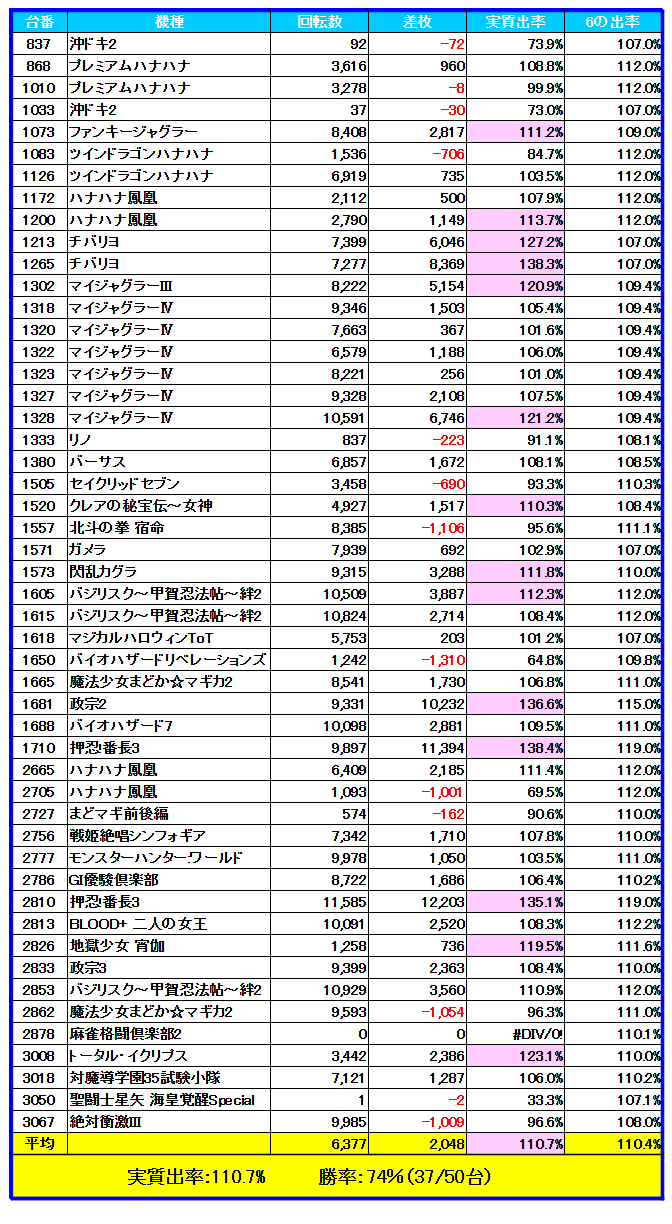 全台系では、定番機種のひとつ【マジカルハロウィン5】で用意され、平均回転数4739Gから平均差枚+1,039枚・出率107.3%・勝率50%と今回も全⑥らしいインパクトある結果とはならず。