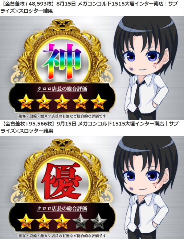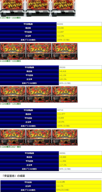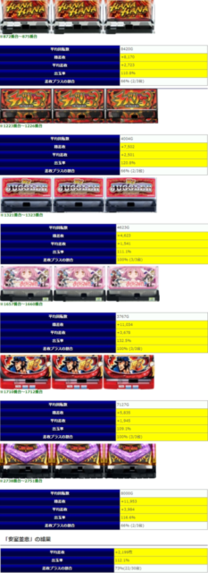 出玉、出率的には前回の9/25と遜色ないものとなったが、勝率が更に少し低めになってしまったのは、平日の開催でもあり全体平均では稼働はかなり低下し、埋もれてしまった箇所が増えた事に起因すると思われるが、【当日の全台差枚は+70,598枚(台平均+112枚)】と、対象箇所以外の稼働が低下した事も大きく作用したとは思われるが、ユーザー目線では好結果である事は間違いないでしょう。