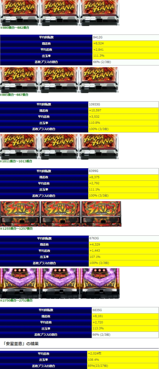ハナハナ、チバリヨなどの沖スロ系が構成の中心ですが、5号機、6号機のAT機等も用意は毎回見られる為、全台系を意識したAT機でも「3台並び」を前提とした察知が結果の安定に繋がると思われます。