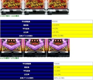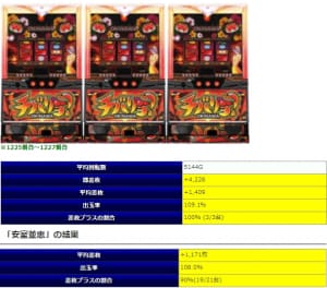 また、AT系よりソフトでインパクトが無いイメージのAタイプからも「Aツインエンジェル」から+7,981枚、「プレハナ」から+5,063枚、「マイジャグⅢ」からは3,000枚オーバーが3台出るなどその持てるポテンシャルは引けを取らない結果となっている。