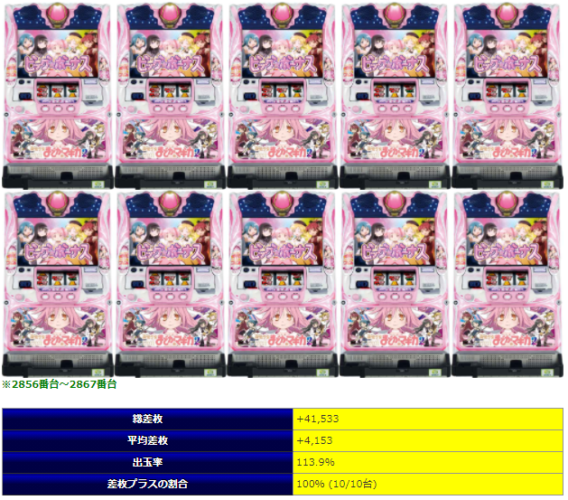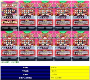 ◎平均8459Gで平均差枚+2,776枚・出率110.9%・勝率97%とマイナス台が1台のみと言う出率、平均差枚も超優秀であり中々見ない数字である。