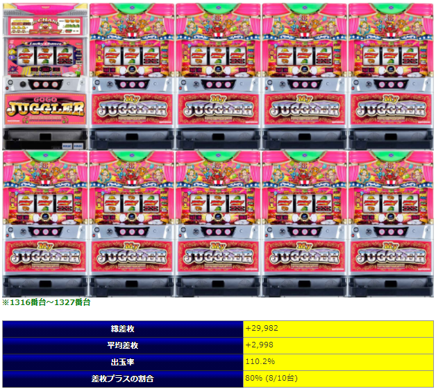 当ホールは毎回沖スロに力が入っていて素晴らしいですね。全台系が不発だったのが、並び全体で平均4993Gで平均差枚+1,636枚、出率110.9%、勝率82%と今回もド安定な数値を叩き出しプラス評価です。