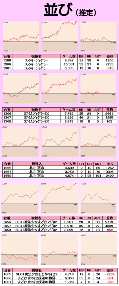 並び系からは今回は複合イベントということで『ハナハナ系』示唆もあったように『ハナハナシリーズ』と『沖ドキ』のやらかしが随所で目立つ結果となった。