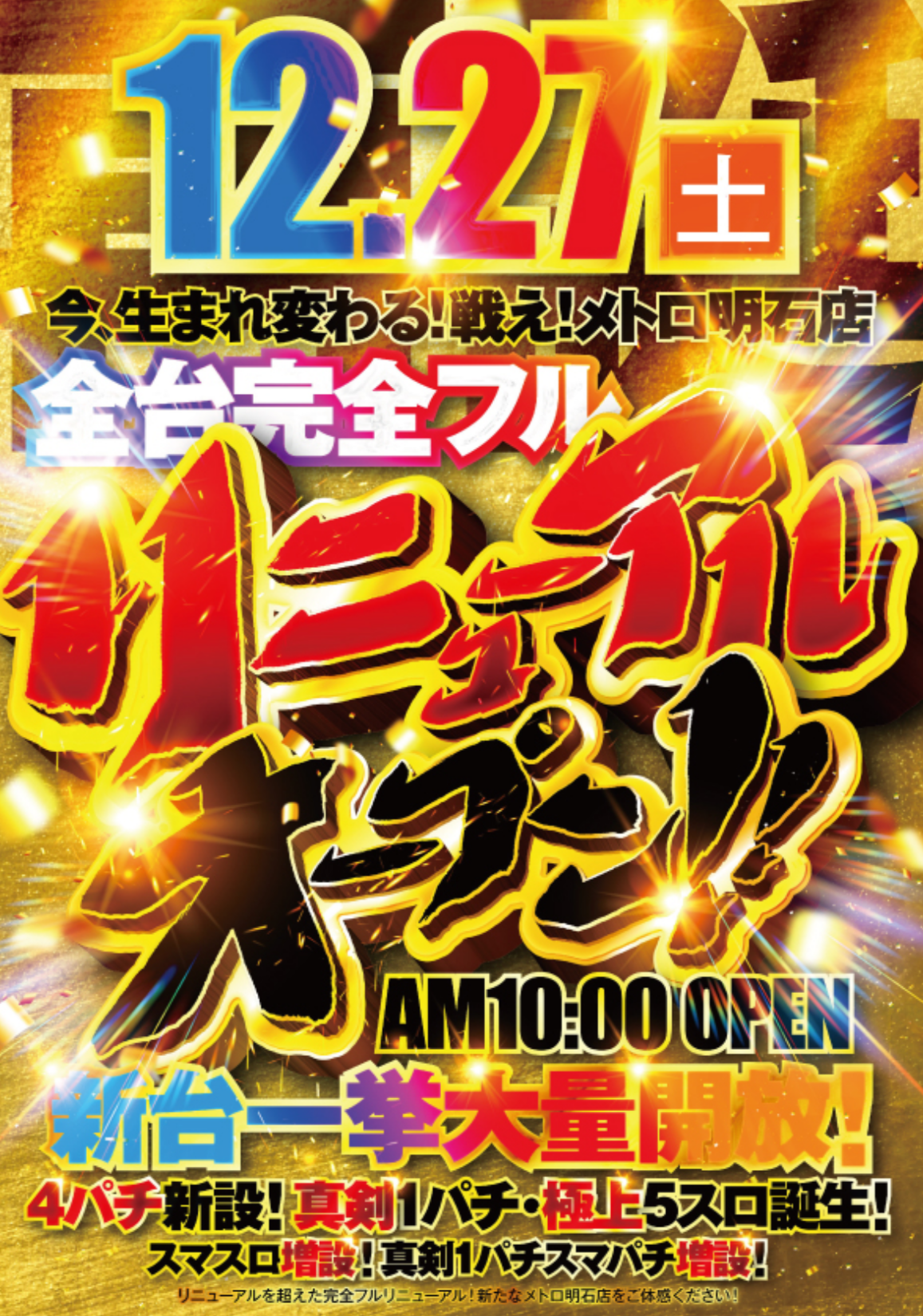 補足説明、公式サイトの情報やと、メトロ明石としてのオープンした日は1988年12月??日(?曜日)、何日の何曜日までは載っておらず不明、メトロライトプラスは記憶に新しく2023年12月13日(水曜日)という。35年が経ち、リニューアルしたとおもわれる、現在明石市内は2000年以降にオープンしたパチ屋が多い中、メトロはずっと残り続けるという点では高く評価出来る。