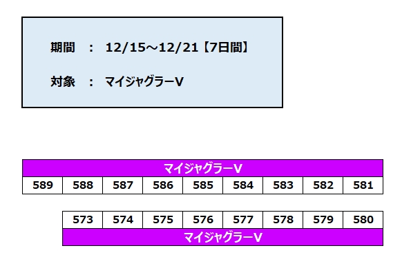 今回の対象機種はマイジャグラーVとなっているので、朝から狙いも定めやすく、平均して1日2~3台の【⑥】が入ることになりそうなので期待ですね。