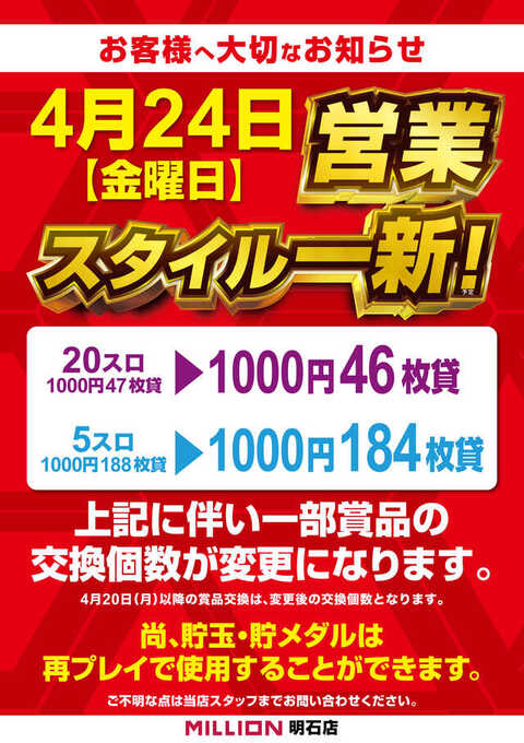 4/24のリニューアルよりスロットの貸しメダル枚数が変更