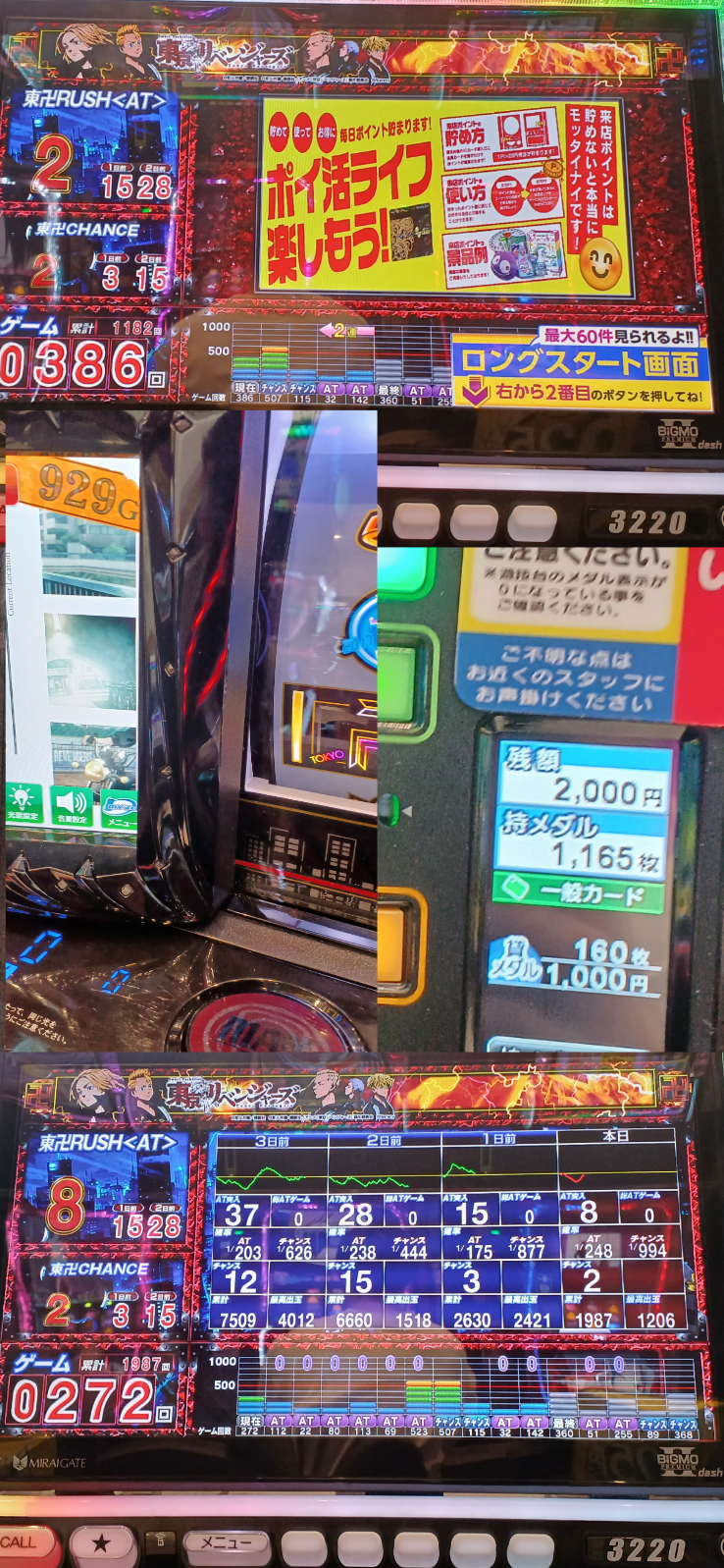 4パチは安定して東京喰種と番長の天下と言わんばかりに好評稼働、さらにその他コーナーもいつもより稼働しており、新台は超甘とヤマトLTのみ稼働確認、仮面ライダーブラックの稼働率はかなり下がっている。4パチ全体の稼働率は2割。