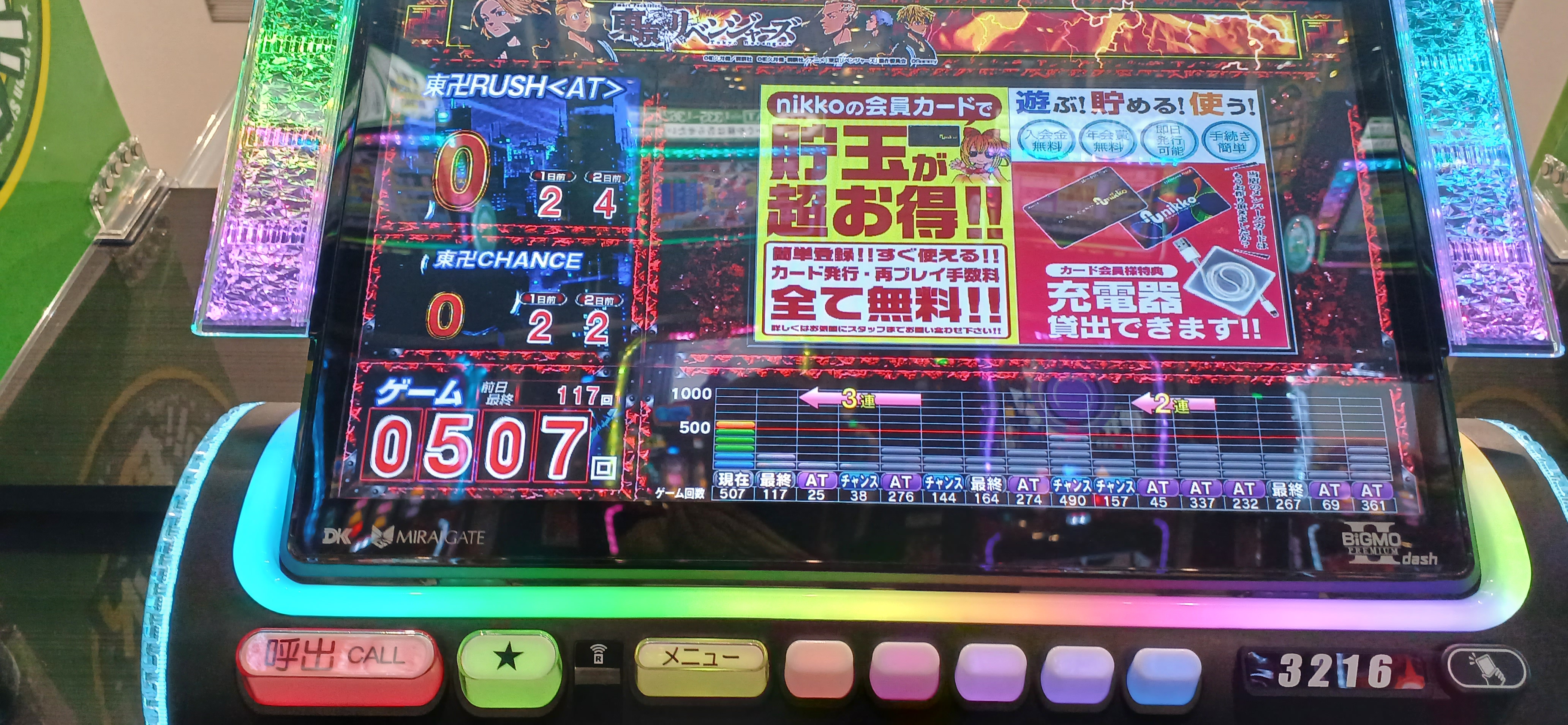 4パチはブルーロックの人気は2割に落ち、デカヘソコーナーや新カスタム解禁の東リべ、喰種などに客が戻っており、全体的に4割程の客数を確認、狙い目的にはギンパラ夢幻199の270Gの台ぐらいだったが、リスクがあるためスルー