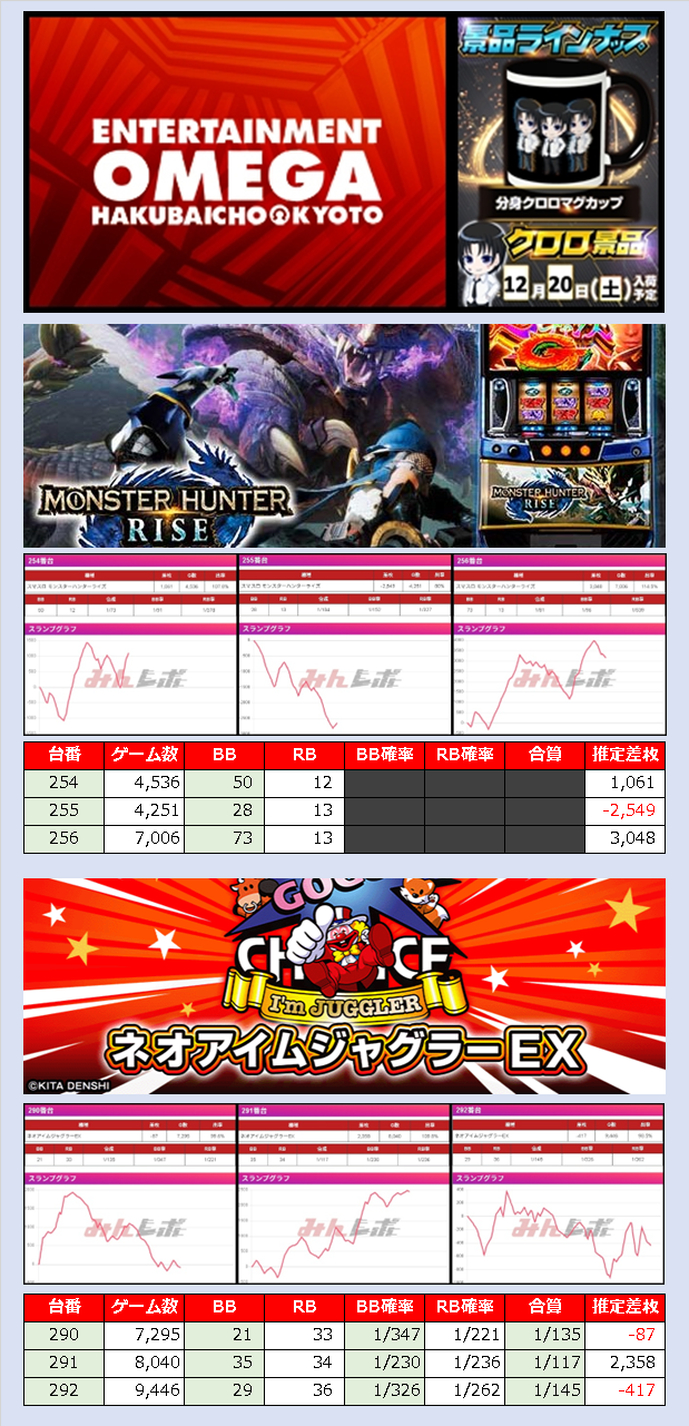惜しくも1台はマイナスとなってはしまったものの、平均2,300枚オーバーは素晴らしいの一言。特に「モンキー」が5,900枚と圧巻の結果を披露しており、これ以上ない結果を見せてくれました。
