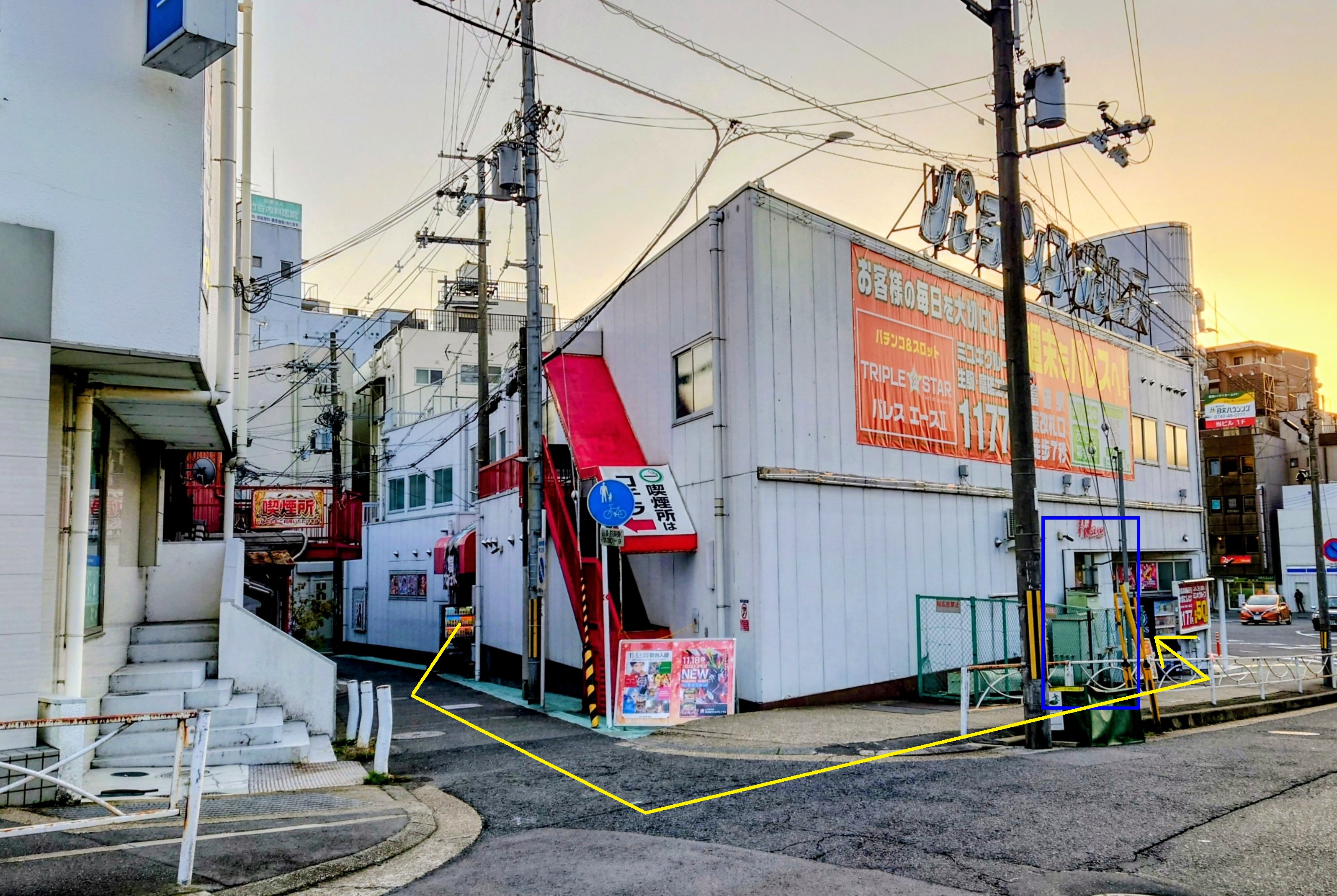 店内景品カウンターを正面に見て、右手すぐにある出入り口から外へ出る。