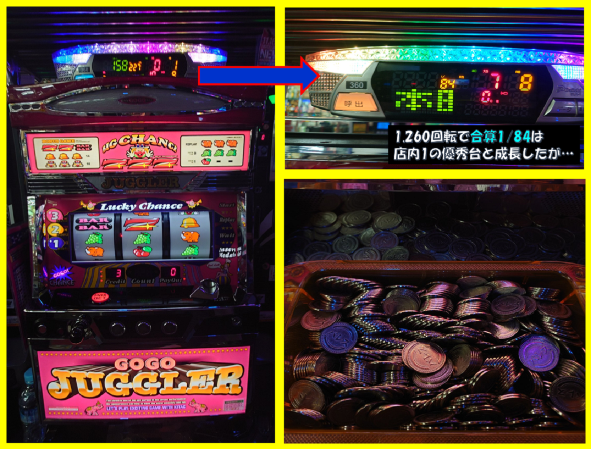 ただ自身が打っていた画像②のゴージャグのように、1.260回転で合算1/84、7-8は優秀な部類。