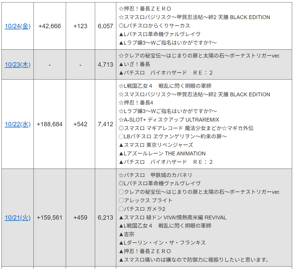 ここもバイオと似ており、6台中5台がプラスとなっており、5000枚以上出ている台もあるため明らかに扱いがよいですね。準新台という立ち位置のため比較的扱いは良かったみたいです。