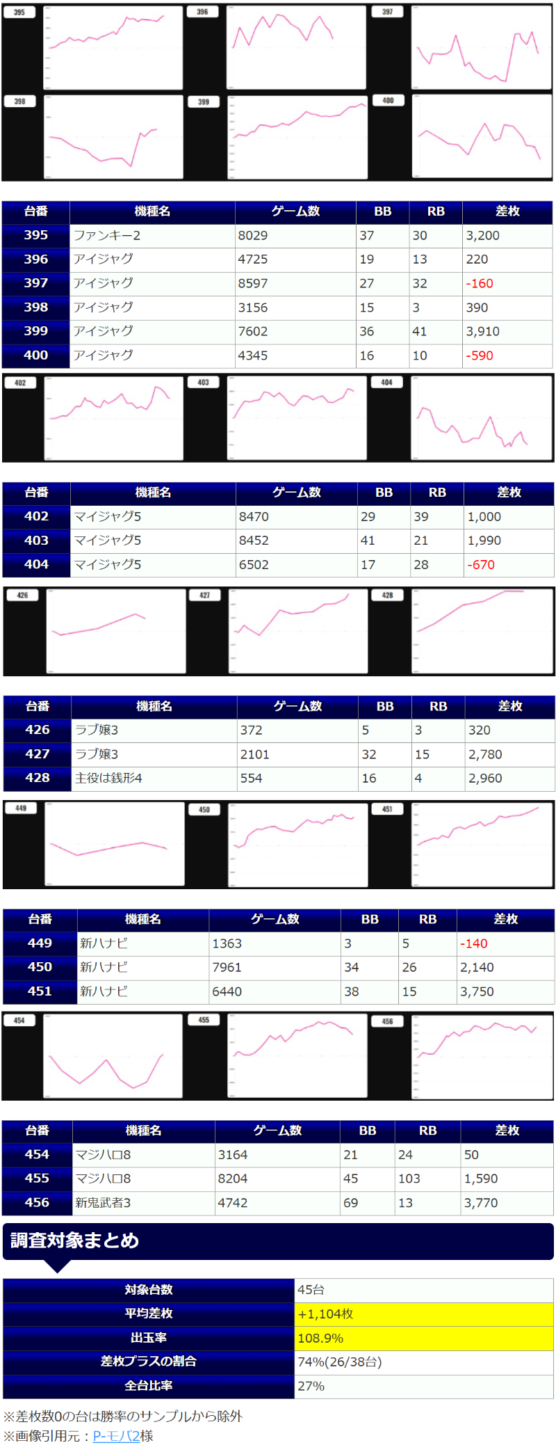 その他にもトリクラ、マイジャグ5、ハッピージャグ、ハナハナ鳳凰天翔などにも半日以上打ち込まれプラス差枚で決着したデータが散見していますしノーマル系の状況の良さは継続していたと判断できそうです。