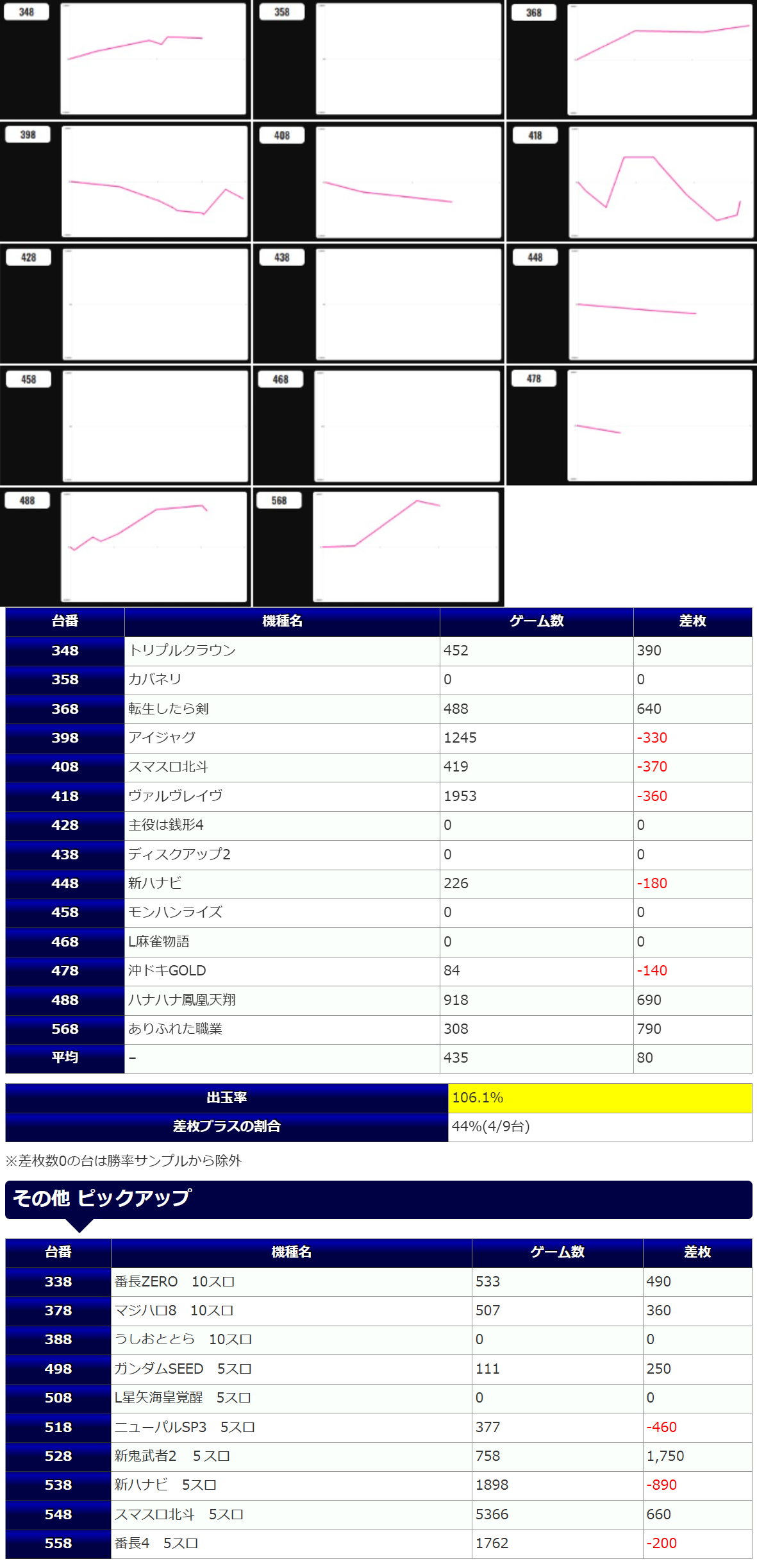 ピックアップ箇所の中でも特に直近の入替で導入された機種が好調で「クレアBT」353番+3,860枚「ギルクラ2」367番+2,680枚「東リベ」373番+8,450枚と良結果が複数確認できていますし今後も狙い目になってきそうです!
