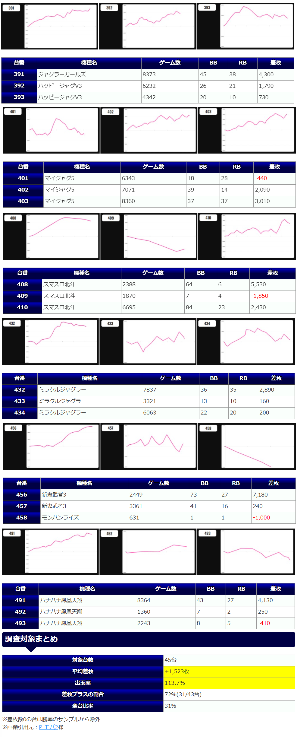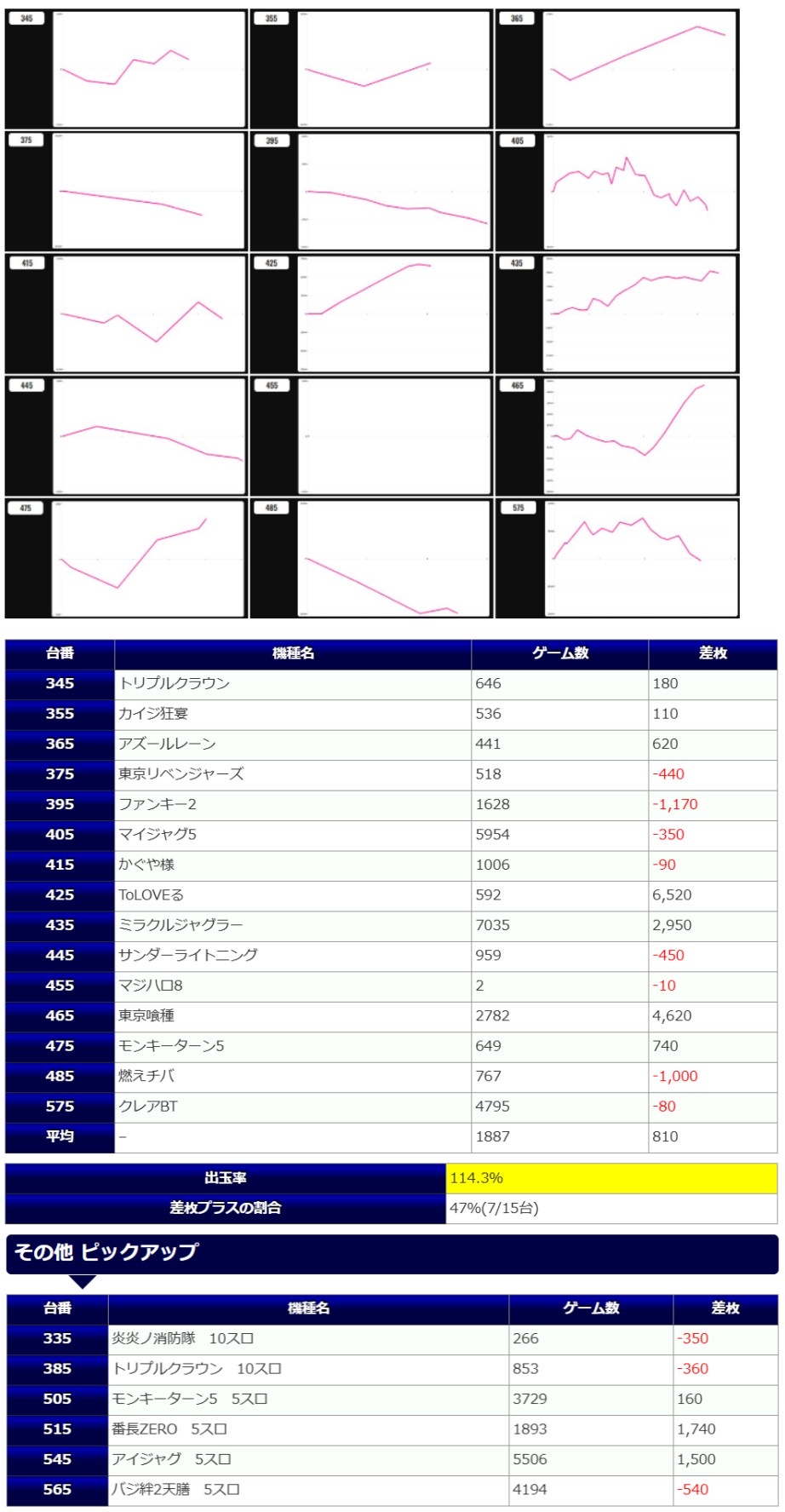 その他個々の出玉結果としては「アズレン」364番台+7,600枚、365番台+5,760枚「バーサスリヴァイズ」443番台+2,630枚、442番台+2,280枚「新ハナビ」450番台+3,010枚「燃えチバ」486番台+3,880枚など優秀出玉が散見。