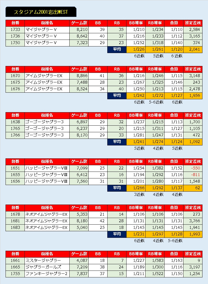 ほぼジャグ連で2400枚出していた剛腕の方もいましたが、ジャグラーが高ベースだったのは間違いないです