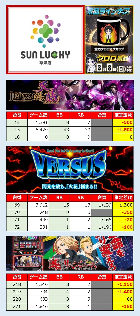 店としての王道機種と箇所に当たりが見受けられる他、並びでの当たりがかなり多めに用意されている印象ですね。