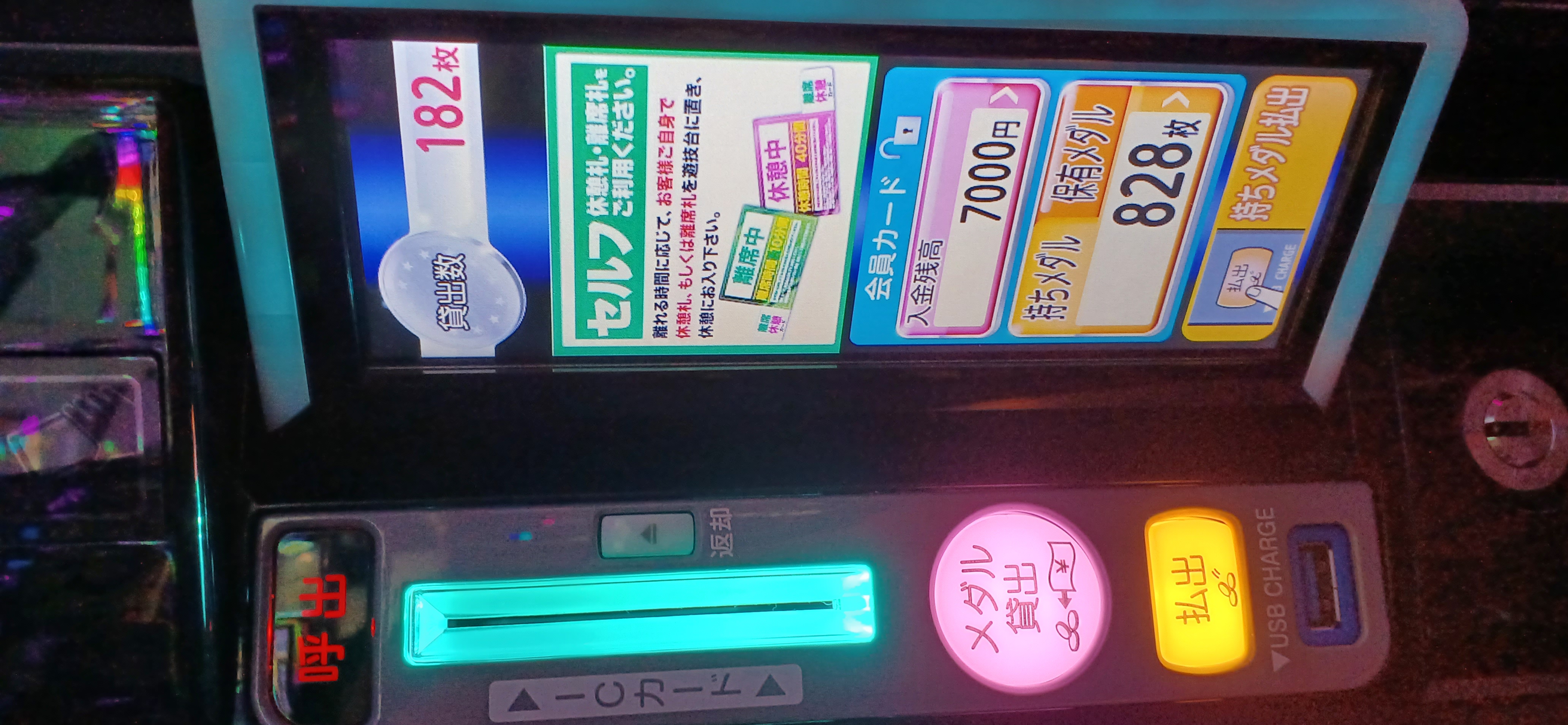 新台は未記載の分は未確認でその他は営業評価に記載済、データ機器問題なし、台間シャッターと肘掛けは有、今回もWi-Fiは未確認、USB有および充電確認、休憩所は変わらず清潔で問題なし、食堂も通常通り良い、装飾の華やかさも特に変化なく問題なし