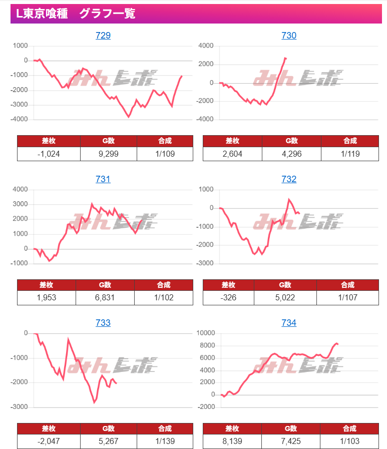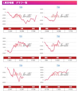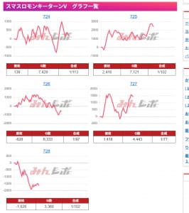 ここも恐らく全⑥。一撃でドーンと出ている台がないにもかかわらず、差枚がしっかりついており9台全てきれいに右肩上がりになっていますね。とにかく下手なことはセス、メイン機を大事に扱いがちな気がします。