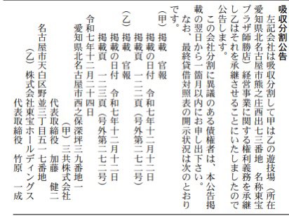 1. 三共株式会社が東宝プラザ師勝店をM&A。