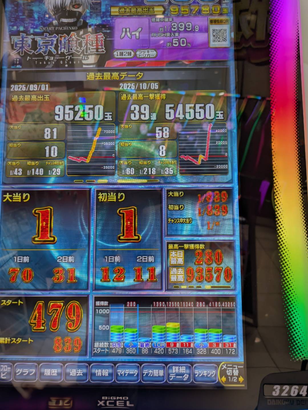 パチンコ、スロットともに徘徊者多数で東京喰種に関しては空き台あれば即埋まり、夜まで賑わってました。