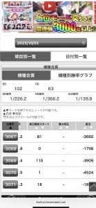 マイ5:勝率6/7、台平均+1005枚(3015番台以外は456かも)